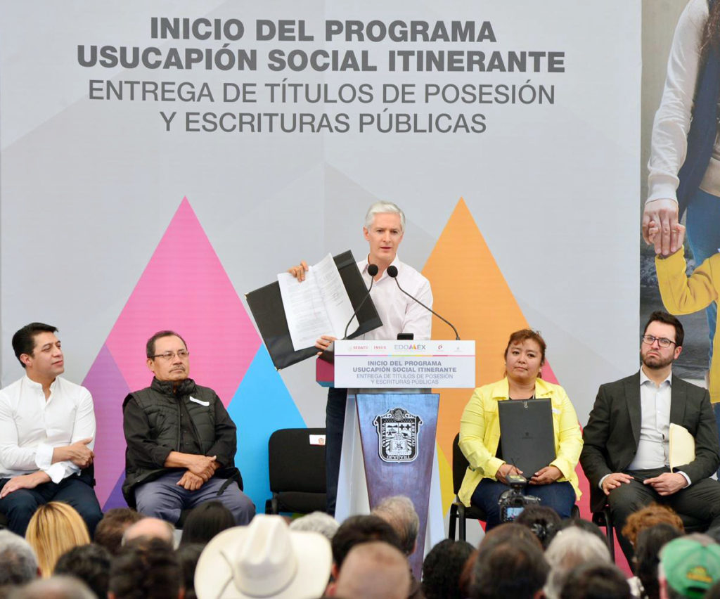 El Gobernador Alfredo Del Mazo Maza puso en marcha el Programa Usucapión Social Itinerante, con el cual se acercan estos servicios a todas las comunidades del estado, con el propósito de otorgar certeza jurídica a las familias mexiquenses sobre su patrimonio.